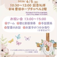 4月5日(日) 🌟 10:30〜12:00 復活祭記念礼拝 子ども向けプログラムもあります。イエス・キリストの復活を記念した特別な礼拝です。どなた様も歓迎いたします😊 礼拝後にはカレーライスのご用意があります。一緒に楽し …